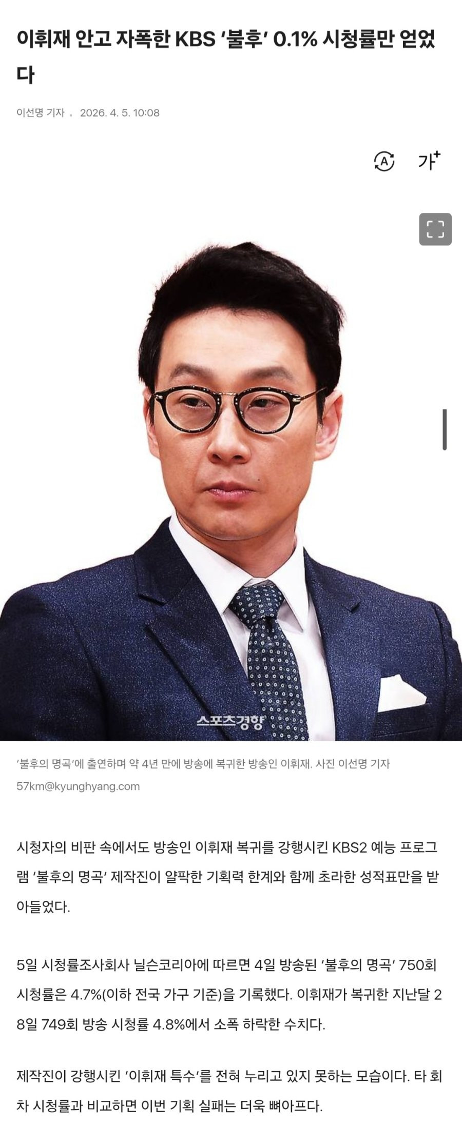이휘재 안고 자폭한 KBS ‘불후’ 0.1% 시청률만 얻었다 - 스포츠경향