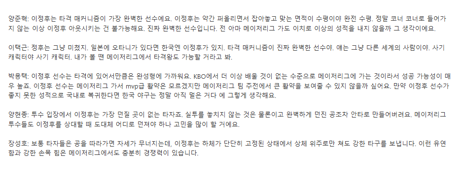 이정후에 대한 상위 평가 조회 508 | 댓글 0건 감정괴물 3시간전 많은 사람들의 이러한 평가와는 반대로 의외로 객관적인 평가를 하셨던 그래도 올해 우익수 전체 연봉 4위니까 한잔해 0