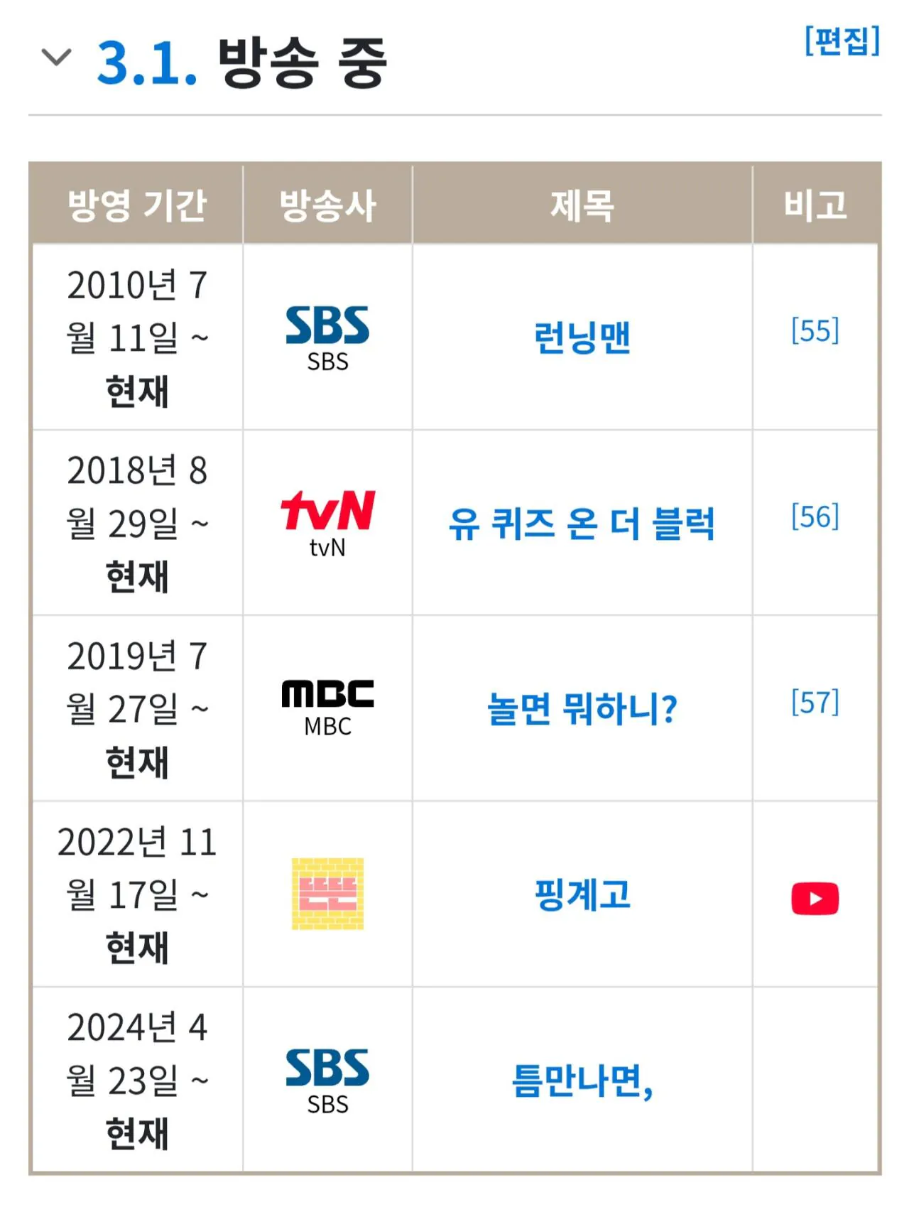 걍 ㅈㄴ 잘해서 방송들이 오래가고 했다하면 방송국 간판되니 많아 보이는 것 뿐임 유재석이 대단한건 많이 해서가 아니라 체력적으로 힘든 프로그램들을 꾸준히해서인거고