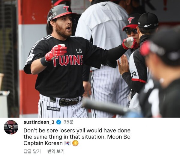 미국에서 동료들의 경기를 주의 깊게 살피던 오스틴은 이 상황을 그냥 넘기지 않았다. 그는 문보경을 비난하는 게시물에 직접 댓글을 달아 대만 팬들의 이중적 태도를 지적했다.