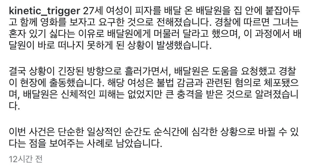 "나랑 영화 봐” 피자 배달원 집에 가둔 20대 여성