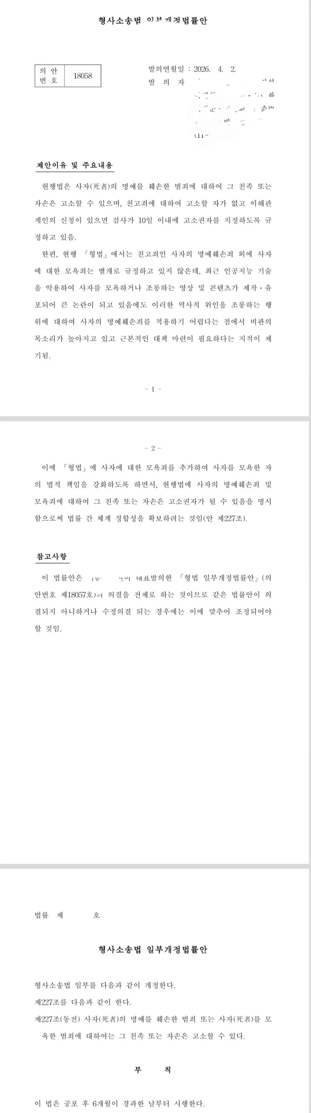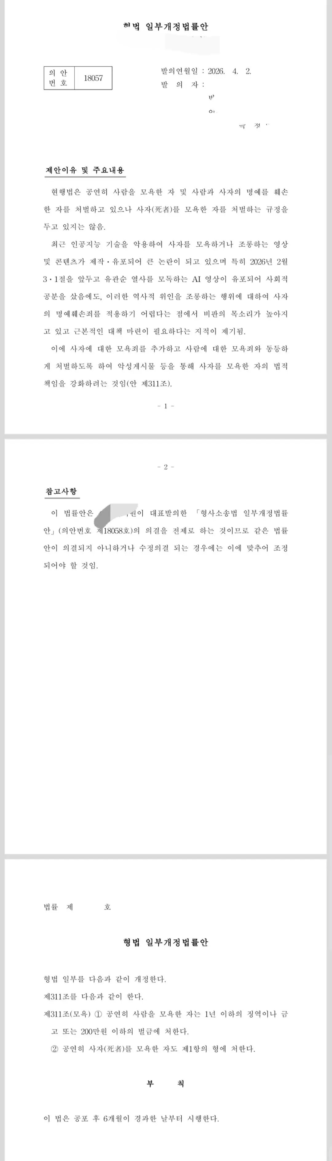 말 그대로 죽은 사람에 대한 모욕이 추가되는 법안 발의됨