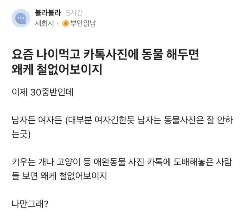 요즘 나이먹고 카톡 프사에 동물 해두면 왜케 철없어보이지