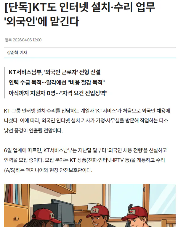 KT도 인터넷 설치·수리 업무 "외국인"에 맡긴다 조회 591 | 댓글 0건 관셈보살 3시간전 https://www.newsway.co.kr/news/view?ud=2026040610185182523 외국인이 집에 들어올 날이 머지 않았구나 0
