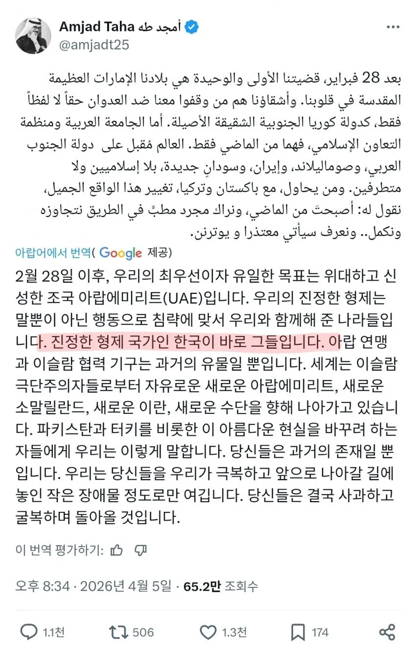 UAE 유명 정치평론가 : 진정한 형제국가는 한국이다 조회 549 | 댓글 0건 공룡 3시간전 말만하는 아랍연맹 이슬람협력기구는 걍 과거의 유물진짜 행동에 나서서 도와준 한국이 ㄹㅇ 형제국이다 입갤 ㄷㄷ 0