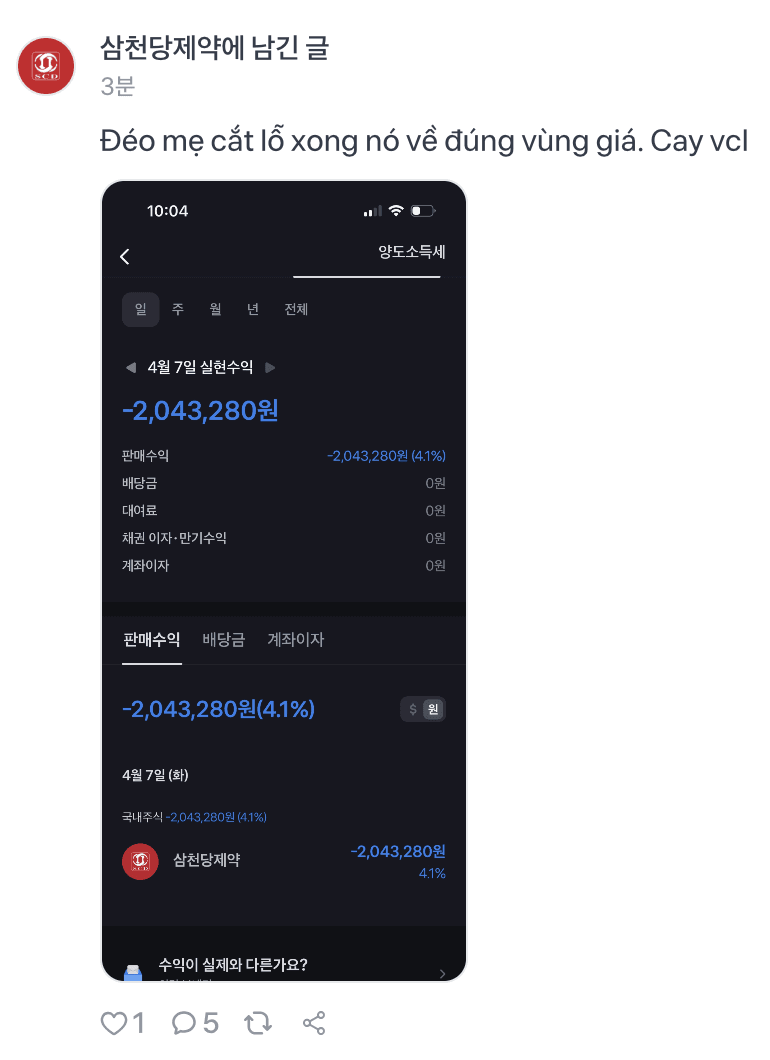 번역 : 손절하니까 바로 본전 오네. 아, 씨X 진짜 열받네.